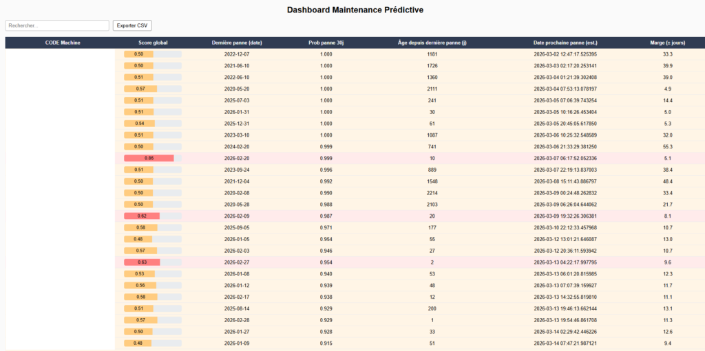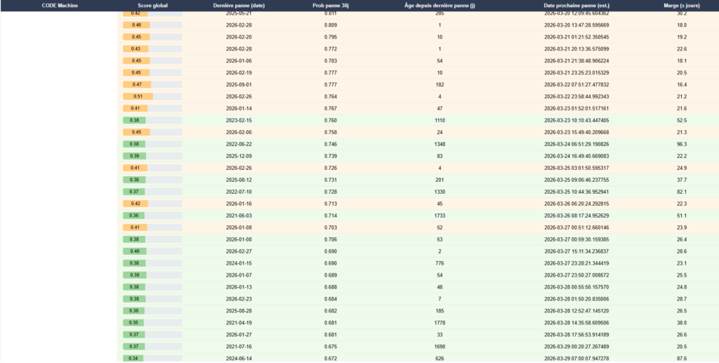 • Calcul pour chaque machine de la probabilité de panne dans les 30 jours (ex : 12 %, 47 %, 83 %…)